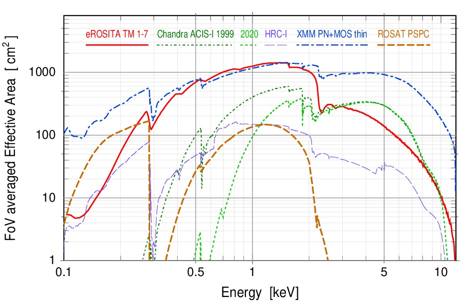 You can see that eROSITA is just about the most sensitive instrument from energies ~0.5keV to ~2keV which is often referred to as the soft X-rayrange which just indicates the lower energy range of the X-ray band. Above 2 keV, the sensitivity of eROSITA drops off at a similar rate as the Chandra instruments, while XMM-Newton wins the sensitivity competition at energies greater than about 2keV. With its large field of view in comparison to Chandra and XMM-Newton, eROSITA will make (and has already demonstrated) significant discoveries to X-ray astronomy.
