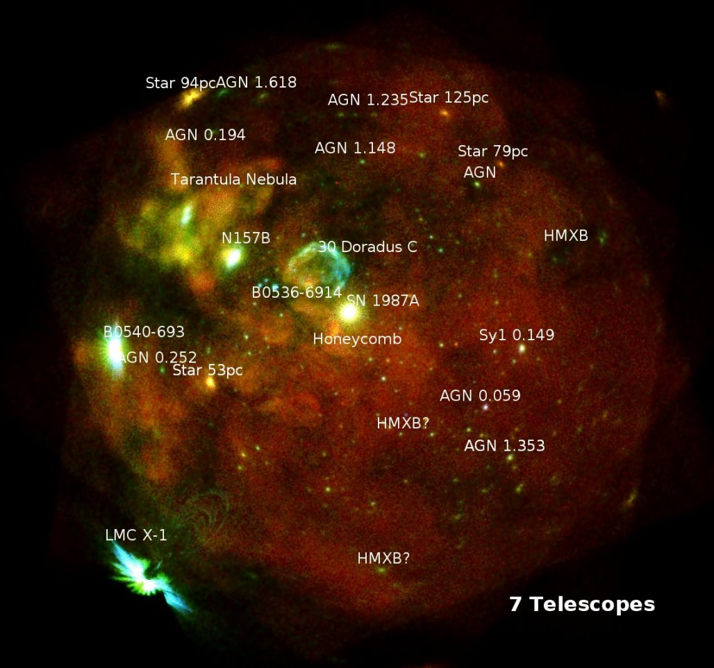 Same image as on the left but labeling bright X-ray sources. The very bright “star” in the near-center position is a famous supernova that was detected in 1987.